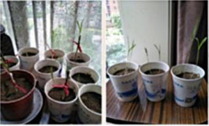 那4次試驗(yàn)都是本人40歲以前搞得,基本有試驗(yàn)田(玉米移栽是未經(jīng)試驗(yàn),直接應(yīng)用于我的自留地);而現(xiàn)在我已年逾八旬,沒(méi)有資金、沒(méi)有設(shè)備,在極其艱難的條件下,就是利用瓶瓶罐罐搞了10次以上的試驗(yàn),這樣的“試驗(yàn)”,也許會(huì)讓某些“專家”們“跌分子”“笑掉大牙”;但我卻樂(lè)此不疲,覺(jué)得獲益匪淺(見(jiàn)圖1)。