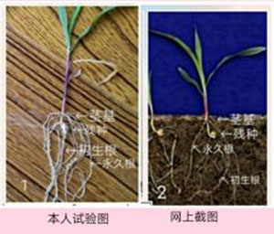 試驗(yàn)結(jié)果:①玉米的軸延體:短、粗、壯,長(zhǎng)度0.5-2.8cm;不定根:早、多、短、粗、壯。②高粱相反,軸延體:長(zhǎng)、細(xì)、弱,長(zhǎng)度3.0-4.0cm;不定根:晚、少、長(zhǎng)、細(xì)、弱。